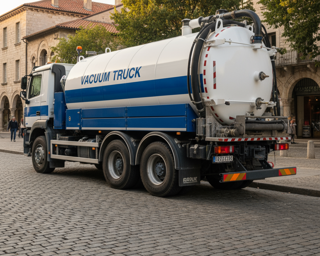 A vacuum truck or tanker is a type of tank truck that has a pump and a tank, designed to pneumatically suck liquids, sledges, slurries or mixtures of sand and water without the contact of any mechanical equipment. Vacuum trucks are used to transport the collected material to a treatment or disposal site.